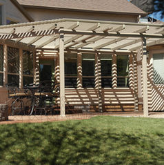 An open vinyl pergola or lattice patio cover lets the sunshine in but leaves your patio space, deck, outdoor furniture, and entry pathways completely exposed to the rain.